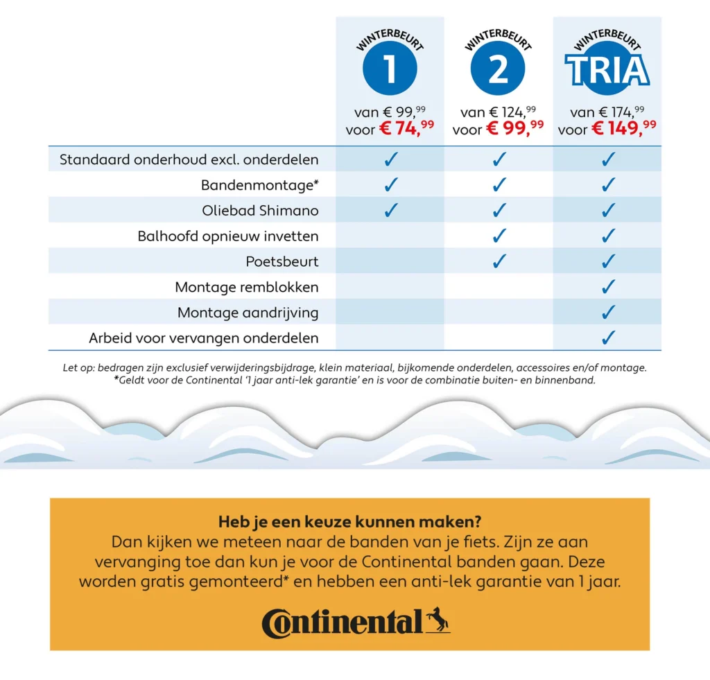 Dus is het tijd voor onze jaarlijkse Winterbeurt! Dit is een uitgebreide onderhoudsbeurt waardoor jouw fiets in goede staat blijft tijdens de wintermaanden en klaar is voor het voorjaar. Tijdens deze beurt wordt de fiets (grondig) gereinigd, afgesteld, gecontroleerd op slijtage en beschermd tegen roest en vuil.