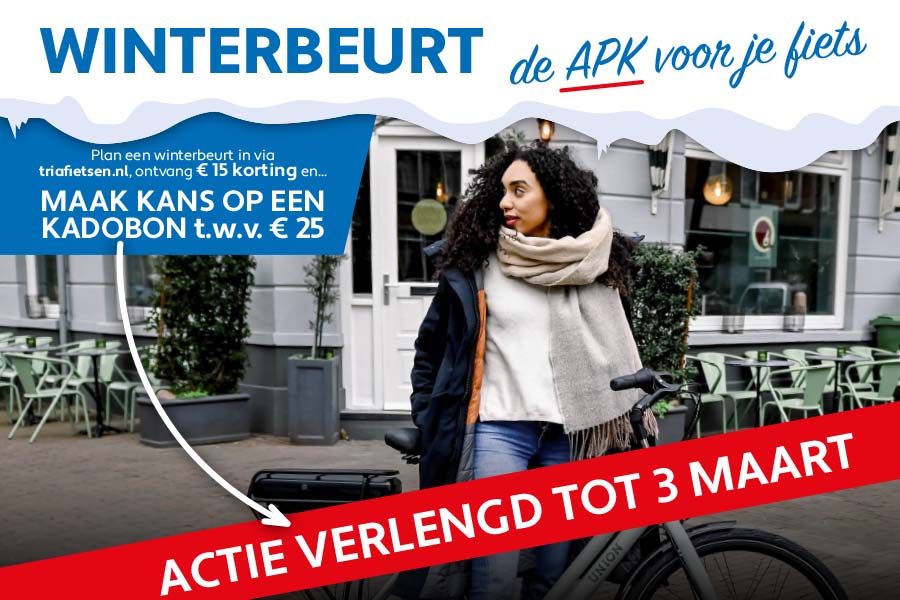 Als klap op de vuurpijl kun je met de winterbeurt ook nog kans maken op een kadobon van € 25,-. Maak online een winterbeurt-afspraak en breng je fiets naar TRIA Fietsen in Lieshout of Brandevoort. Deze actie en de winterbeurt is verlengd tot en met 2 maart 2024.